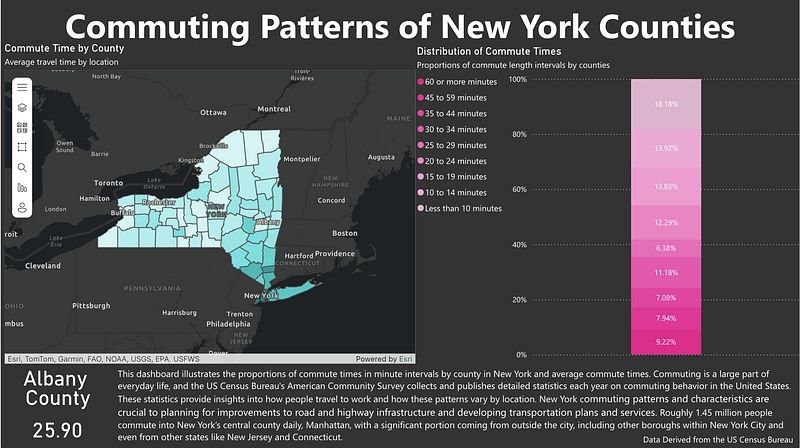 In New York, there are 62 counties, all of which differ in commute times for their residents. This project explored commute times and commuting patterns across these counties using data from the U.S. Census Bureau’s American Community Survey (ACS). The average commute time is one-way, excludes remote workers, and includes all transportation types. The ACS collects and publishes detailed statistics each year on commuting behavior in the United States, which provides insights into how people travel to work and how these patterns vary by location. The USCB details that they collect this data to inform public policy, infrastructure planning, and economic analysis. They ask questions about where people work, how they get there, when they leave home, and how long it takes to create statistics. These commuting patterns and characteristics are crucial to plan for road and highway infrastructure improvements and develop transportation plans and services. Local, state, and federal transportation agencies will plan programs and services based on these statistics for disabled populations, bicycle commuters, carpools, and ride shares. The Department of Transportation uses these stats to ensure regulations are being adhered to so that they can understand current uses and predict future transportation needs (US Census Bureau, 2023). Employment planning, protection against employment discrimination, defining banking and housing markets, and planning emergency response are all influenced by the patterns behind commuting as well. Businesses also find it helpful when they are deciding where to locate themselves, such as a coffee shop being located where people work. Researchers also use these commuting estimates to study the effects of long commutes on health and the environment. Commute times are a crucial aspect of our daily lives that need to be studied for improvements to be made and for its effects on us to be known.