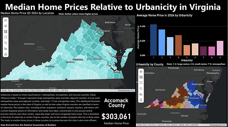 Median home prices across the United States have been found by using the House Price Index growth data from FHFA and combining it with the latest housing statistics from the American Community Survey (NAR, 2025). These home values show the overall worth of all homes in a given area, as opposed to just home sales data. Housing costs in Virginia, whether buying or renting, are near an all-time high. The average home price in Virginia rose from $225,000 in December of 2013 to $372,000 in December of 2023 (Horowitz, 2024). Six Virginia areas have average home prices exceeding $1,000,000: Great Falls, McLean, Dunn Loring, Vienna, Upperville, and Waterford. All of these areas are included in the greater metropolitan area of Washington, D.C., which explains the high prices, as these areas also have high populations of creative class workers. Washington D.C’s creative class makes up nearly half the metro’s workforce (Florida, 2017). Four of the Metro’s top ten creative class neighborhoods are in Arlington, with median home prices of $910,843, and one in Alexandria, with median home prices around $816,533. Across the US, the creative class increasingly clusters together in its own areas, separate from the less advantaged service and working classes.